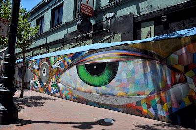Mid market is a desolate stretch of abandoned store fronts and SRO’s. This long frontage of boarded up building has been covered by an artist known as Chor. This is not any random street painter, Chor has a worldwide body of work, including a commissioned piece for the Beijing Olympics. His website